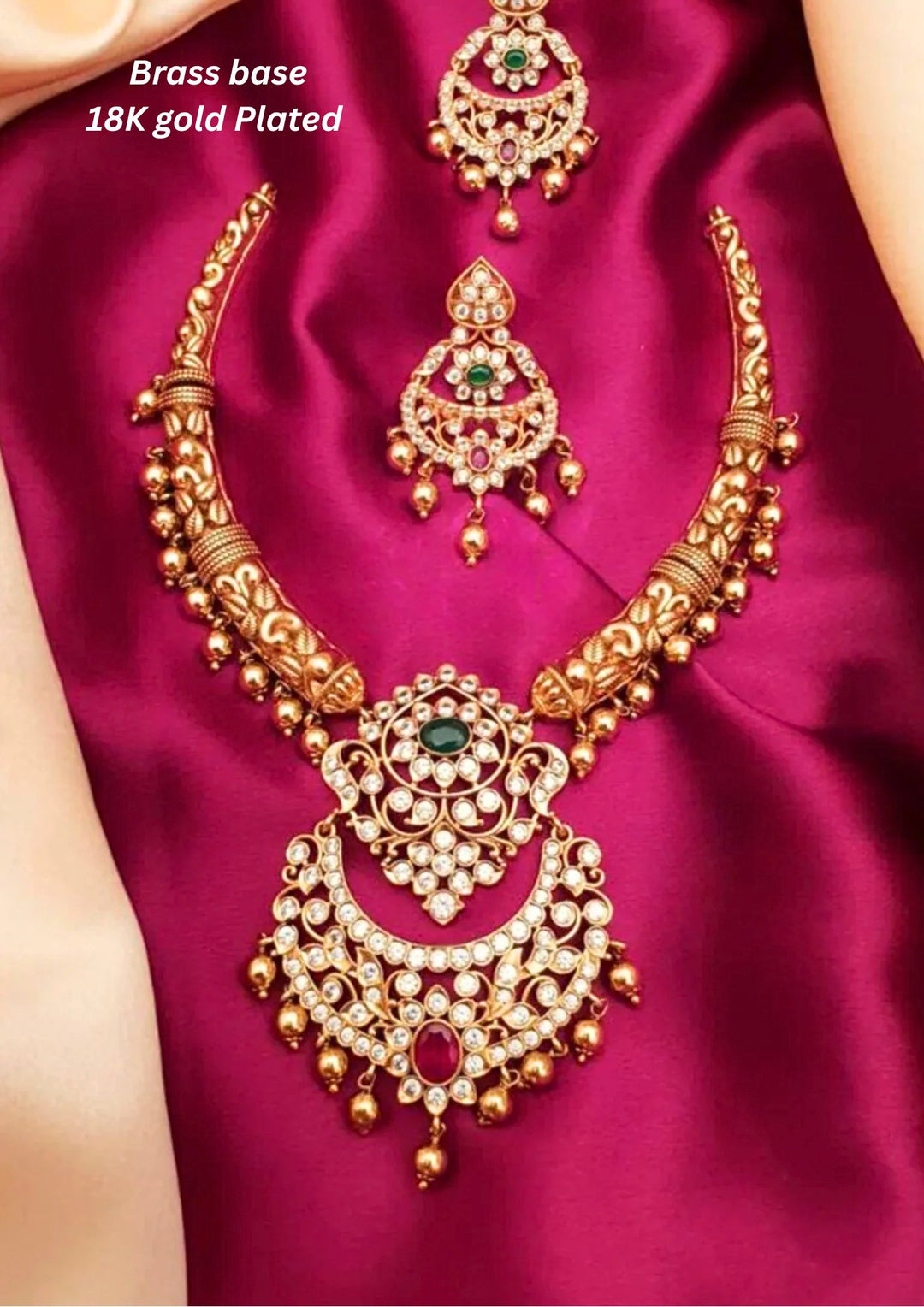 Kundan & Beads Brass Base Gold Plated Matt Finish Necklace With Earrings c 10...