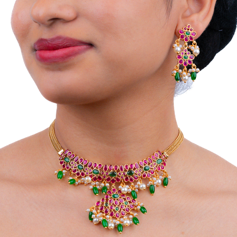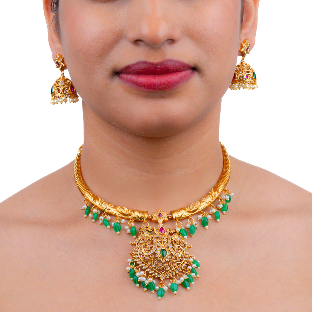 Kundan & Beads Brass Base Gold Plated Temple Necklace With Earrings g 102050