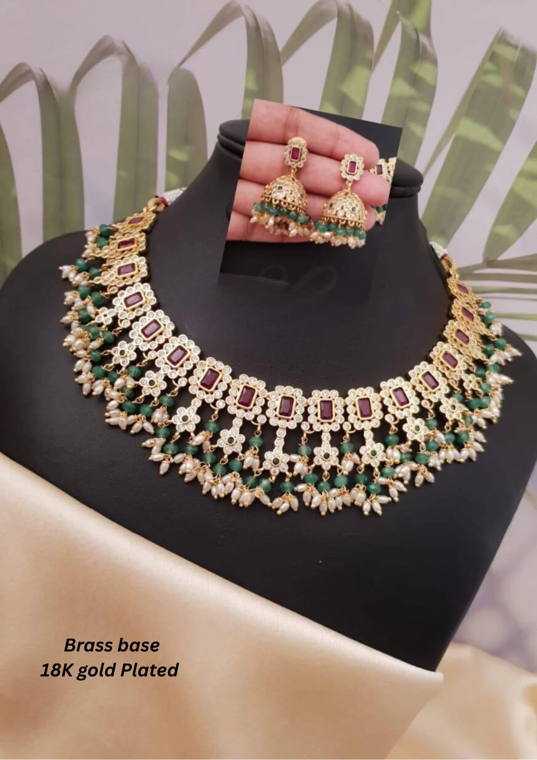 Kundan & Beads Brass Base Gold Plated Matt Finish Necklace With Earrings c 10...
